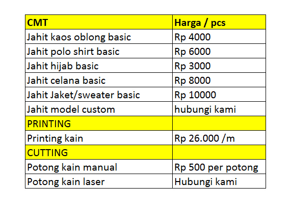 Pada dasarnya harga jasa jahit CMT, makloon, printing, maupun potong kain sangat tergantung permintaan dan kebutuhan. Berikut ini adalah daftar harga standar kami. Daftar harga ini masih berupa estimasi. Untuk harga pastinya, silahkan menghubungi kami.